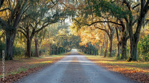 © Radetdararith, Obraz premium A picturesque oak tree-lined road during autumn, with colorful leaves falling.