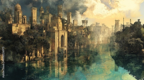 Obraz premium A picturesque, old city skyline with towering structures reflected in the...