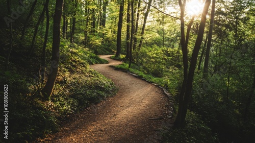 Fototapeta premium A picturesque outdoor hiking trail with winding paths, dense forest, and sunlight filtering through the trees