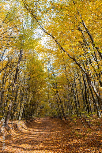 © Oleh Marchak, Obraz premium A picturesque path in the autumn forest. beautiful nature, tranquility, relaxation