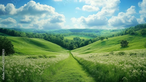 © Arifin Studio, Fototapeta premium A picturesque path winds through a lush green valley, leading towards a distant horizon under a clear blue sky with fluffy white clouds.