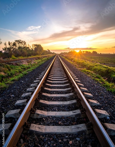 Fototapeta premium A picturesque railway track stretches into a vibrant sunset, showcasing a...