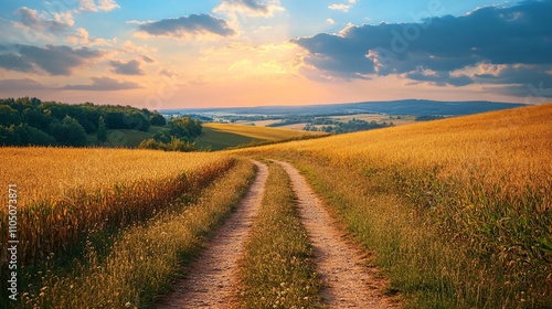Fototapeta premium A picturesque rural landscape featuring a trail through golden fields,...