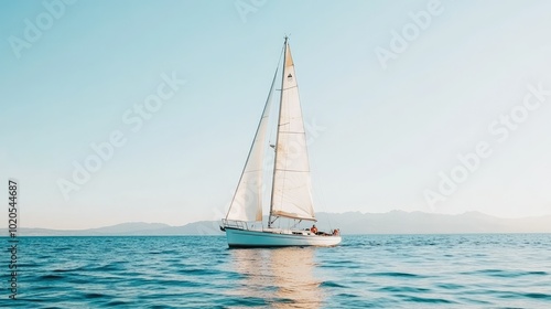 © arthit, Fototapeta premium A picturesque sailboat on a serene blue lake, flanked by mountain ranges under a clear sky. The water is still, creating a perfect reflection. Great for travel inspiration.