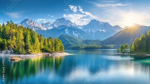 Naklejka premium A picturesque scene of a tranquil lake nestled amidst towering mountains,...