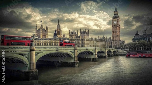 © Suphawan, Naklejka premium A picturesque scene of Big Ben and the Houses of Parliament in London, with the River Thames flowing calmly and iconic red double-decker buses crossing the bridge.