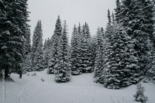 © Picstocker, Naklejka premium A picturesque scene of snow-clad pine trees, standing tall and majestic