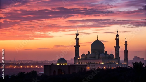 © Nataliya Selyutina, Obraz premium "A picturesque silhouette of a mosque with domes and minarets against a stunning sunset. The sky is filled with shades of orange, pink, and purple. In the distance, the city lights twinkle. Perfect fo