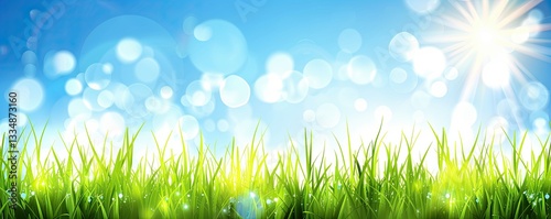 © Velar, Obraz premium A picturesque spring garden featuring fresh green grass under a bright blue sky with sunlight shining