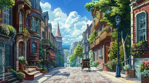 © Pixel, Fototapeta premium A picturesque street scene with charming buildings and lush greenery.