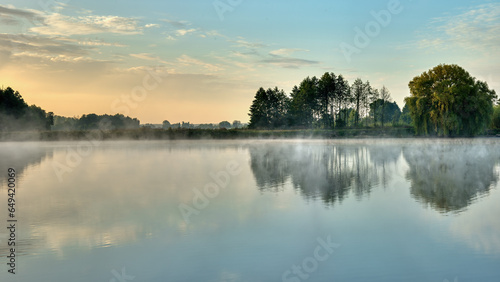 Fototapeta premium A picturesque sunrise over a foggy lake with trees on the shore reflected in the water. Morning of the end of summer, beginning of autumn.