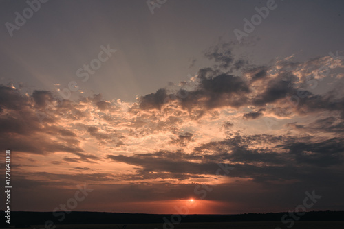 © Höyka Studio, Fototapeta premium A picturesque sunset scene featuring a vibrant array of colors in the sky. The sun is setting on the horizon, casting a warm glow on the clouds and the land below.