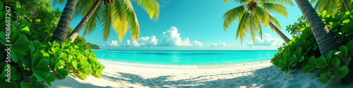 Fototapeta premium A picturesque tropical beach with white sand, turquoise water, and palm trees...