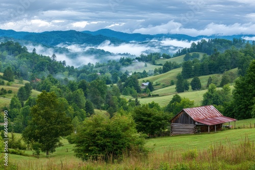 © jemb, Obraz premium A picturesque valley scene with a rustic barn nestled among rolling hills.