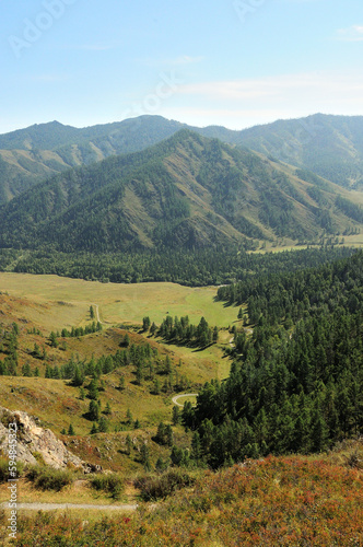 © Алексей Желтухин, Fototapeta premium A picturesque valley surrounded by high mountains on the edge of a dense coniferous forest in the rays of the bright summer sun.