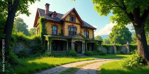 Fototapeta premium A Picturesque Victorian House Adorned with Lush Greenery, Nestled Serene in a...