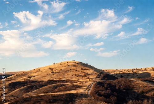 © Denis Chubchenko, Naklejka premium A picturesque view of a gently rolling golden hill, lit by the sun, under a bright blue sky with light cirrus clouds. A beautiful rural landscape in warm tones, conveying the spaciousness and tranquil