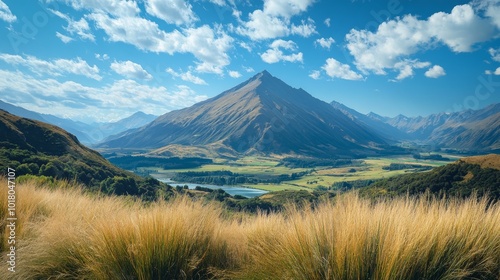 Naklejka premium A picturesque view of a mountain range with a valley and lake in the distance, surrounded by lush green vegetation under a clear blue sky with fluffy white clouds.