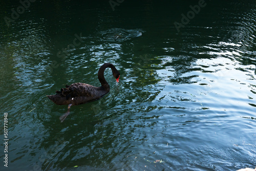 Fototapeta premium A picturesque view of a rare black swan in nature. close-up of a black swan...