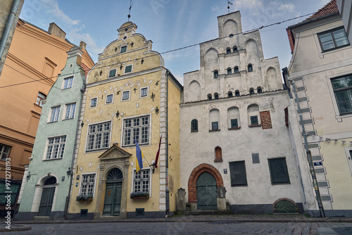 Fototapeta premium A picturesque view of the Three Brothers, a trio of historic buildings in Riga, Latvia. The cobblestone street, adorned with charming flowerpots, adds to the charming atmosphere. The buildings' intric