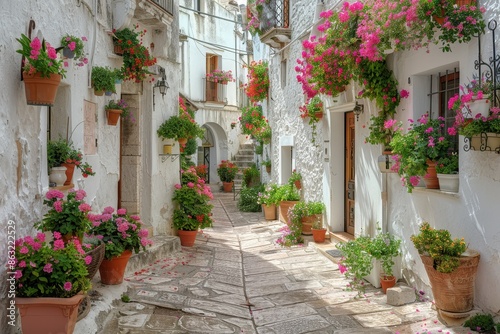 Fototapeta premium A picturesque village in the Mediterranean, with narrow streets, white-washed buildings, and blooming flowers.