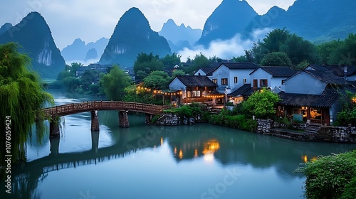 Fototapeta premium A picturesque village nestled amidst mist-covered mountains, with a wooden bridge spanning a tranquil river.