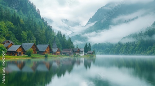 Fototapeta premium A picturesque village nestled amongst misty mountains and a serene lake,...