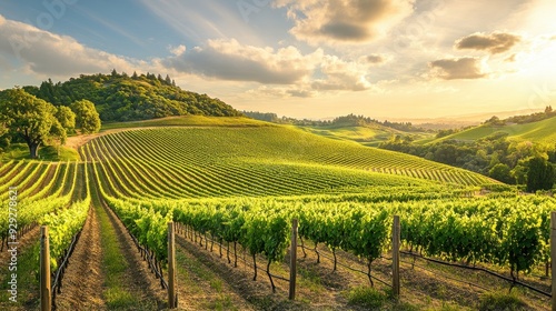 Fototapeta premium A picturesque vineyard landscape at sunset, showcasing rows of grapevines and rolling hills.