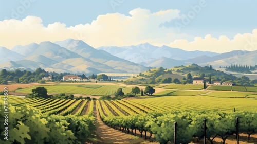 Fototapeta premium A picturesque vineyard landscape with rows of grapevines and distant mountains - Generative AI