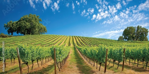 Naklejka premium A picturesque vineyard showcases meticulously organized grapevines set against a bright blue sky. Enjoy the beautiful vineyard landscape.
