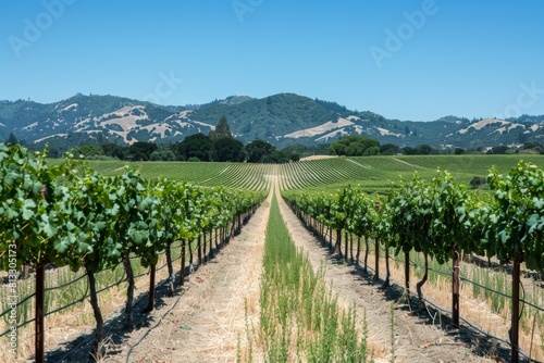 © Amni, Fototapeta premium A picturesque vineyard with rows of grapevines stretching into the distance
