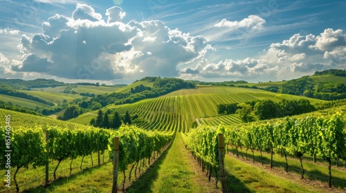 Naklejka premium A picturesque vineyard with rows of grapevines stretching towards a distant hillside, framed by a bright blue sky with fluffy white clouds.