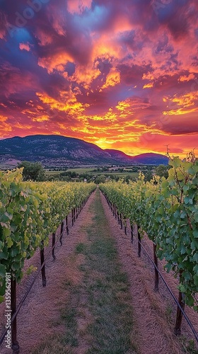 © Nurillo, Fototapeta premium A picturesque vineyard with rows of grapevines under a golden sunset sky pic