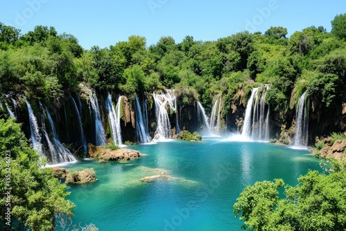 © Asayamrad, Fototapeta premium A picturesque waterfall cascades into a serene turquoise pool, surrounded by lush greenery under a clear blue sky.
