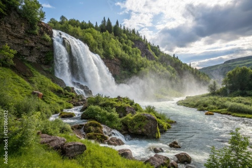 Fototapeta premium A picturesque waterfall cascading down a rocky slope surrounded by greenery,...