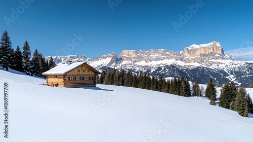 © Preecha, Naklejka premium A picturesque winter scene showcasing a mountain range dusted with snow, with rocky outcrops visible beneath the white blanket. A charming log cabin in the foreground is surrounded by pine trees,