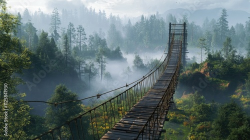 Obraz premium A picturesque wooden suspension bridge spans a lush, misty forest, surrounded...
