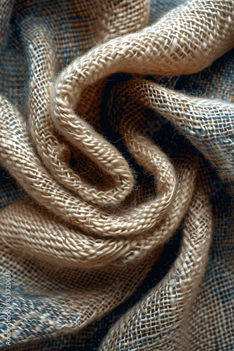 © Nataliia_Trushchenko, Fototapeta premium A piece of fabric with a brown and blue pattern. The fabric is rolled up and has a fuzzy texture