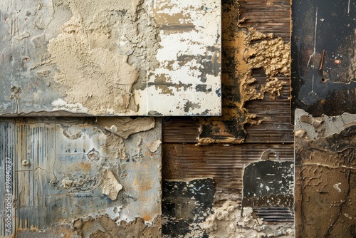 © Iftikhar alam, Naklejka premium A piece of wood showing signs of weathering with paint peeling off, Experiment with contrasting textures and materials to convey a sense of depth and dimension