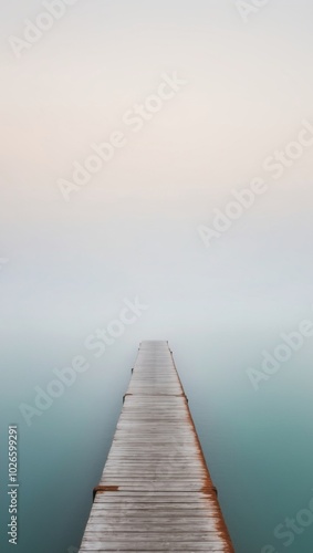 © LoFi J., Fototapeta premium A pier stretches across a foggy blue body of water.