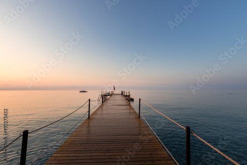 © Sergei, Obraz premium A pier with a boat in the water and a red flag on it