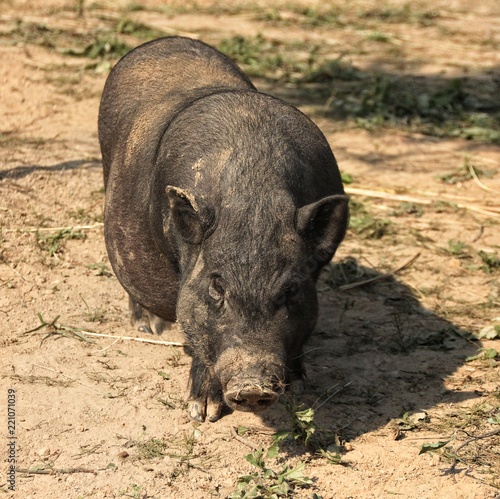 © Natalya, Fototapeta premium A pig walks in the street digs a brown earth