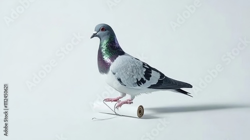 Fototapeta premium A pigeon perched on a clean white surface with a small rolled letter tied to its leg, sharp focus, minimalistic and crisp design
