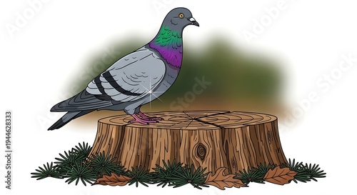 Fototapeta premium A Pigeon Perched on a Tree Stump illustration