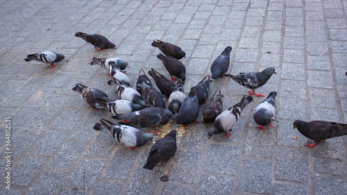 © CuteIdeas, Fototapeta premium A Pigeons Eat From The Cobblestones Of Seeds And Bread Crumbs