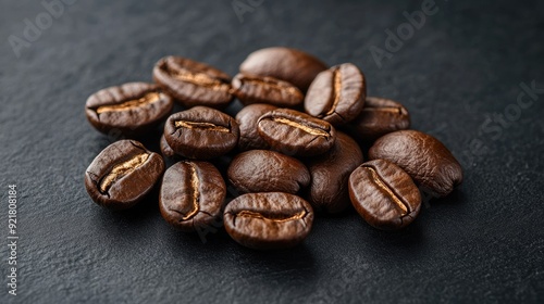 © At My Hat, Naklejka premium A pile of coffee beans on a dark surface. The beans are of different sizes and are spread out