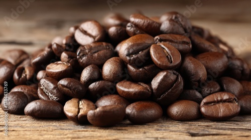 Fototapeta premium A pile of coffee beans on a wooden table. The beans are of different sizes and shapes, and they are spread out in a pile. Concept of abundance and variety
