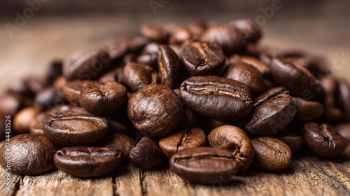 Fototapeta premium A pile of coffee beans on a wooden table. The beans are of different sizes and shapes, and they are spread out in a random pattern. Concept of abundance and variety