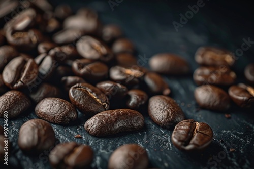 © Ева Поликарпова, Naklejka premium A pile of coffee beans sitting on a table, perfect for decorating or use in still life photography