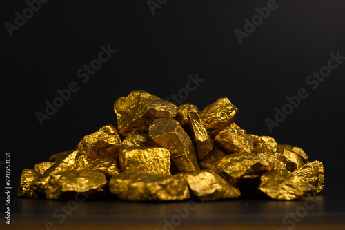 © pookpiik, Fototapeta premium A pile of gold nuggets or gold ore on black background, precious stone or lump of golden stone, financial and business concept.